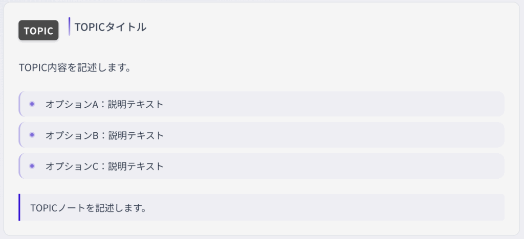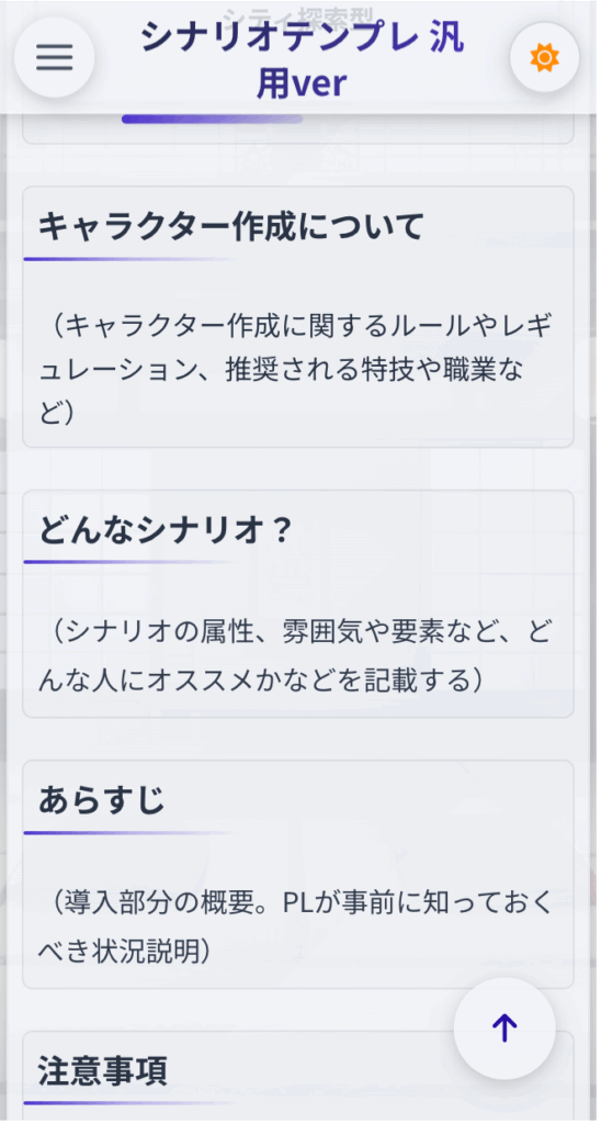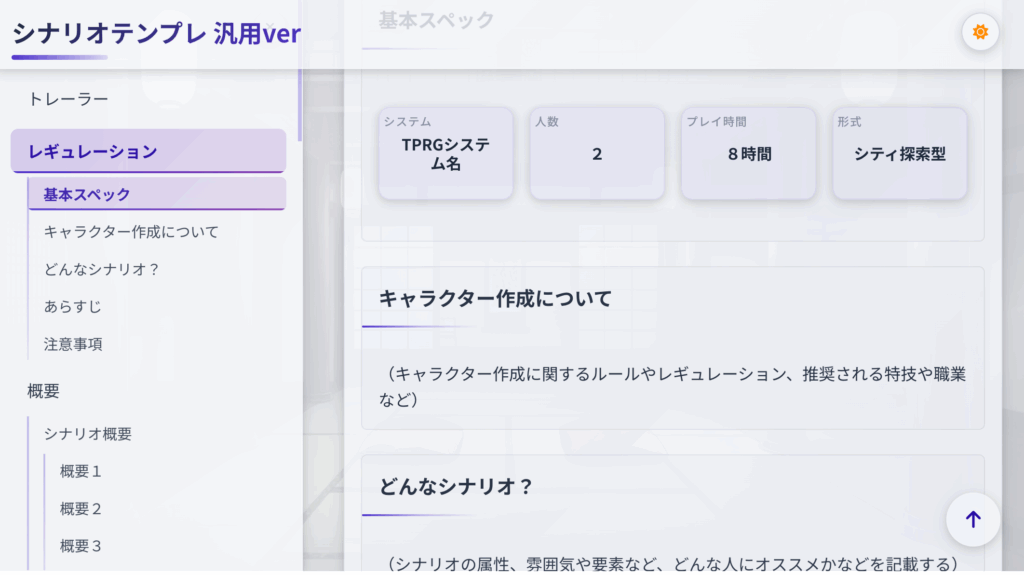 見出しから自動的に目次を生成し、現在読んでいる箇所をハイライト表示。長いシナリオでも迷子にならず、スムーズに目的の情報にアクセスできます。