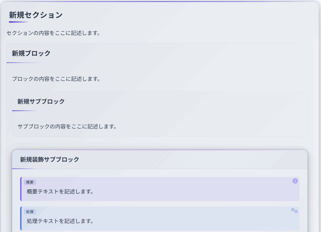 セクション、ブロック、サブブロックを積み木のように組み合わせてシナリオを構築。それらは並び替えも可能で、構造化された美しいシナリオシートが自然と出来上がります。