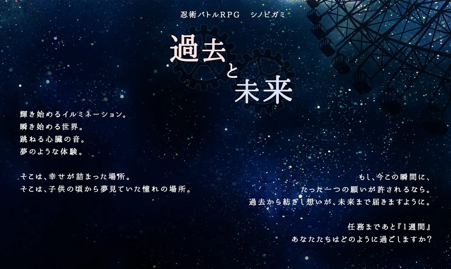 ずっと一緒に過ごしてきたキミたちは、ある日二つの宝玉を回収する忍務を受ける。忍務までの一週間は休暇となった。さて、どのようにして過ごそうか。